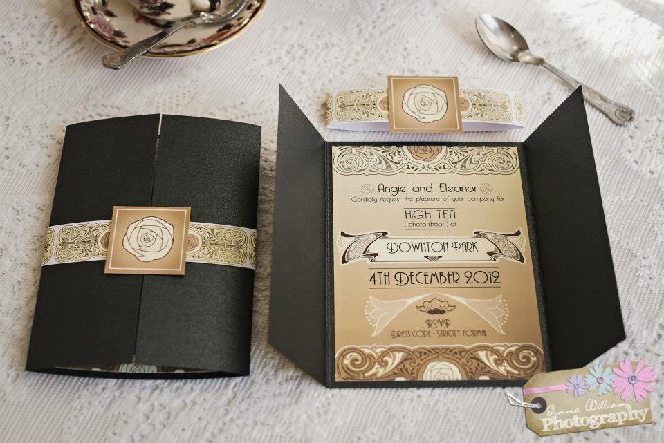 I was privileged to be involved in this lovely shoot which took place at Parkfields Country House and was organised and styled by Le Glow, Beautiful Brides. Eleanor and Angie put so much work into the ‘Downton Inspired’ look, and the results were fabulous! Models: Jo Jones, Ellis Jessica Walby, Julia Hay, Nick Griffin. Dresses: Lily Oliver Bridal Boutique, Suits: Bill Child Formal Wear, Stationery: BlueBird Wedding Stationery, Flowers: Buttercup Flowers, Jewellery: Quartz Design. The 1920’s style invitation can be re-created for a wedding, just get in touch for details. The wonderful photography was taken by Gemma Williams Photography. the full photo shoot can be found here