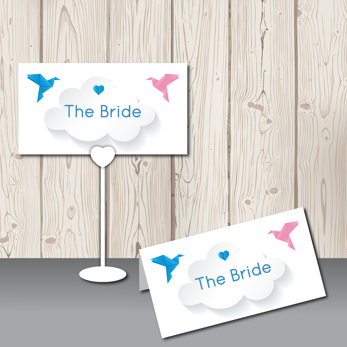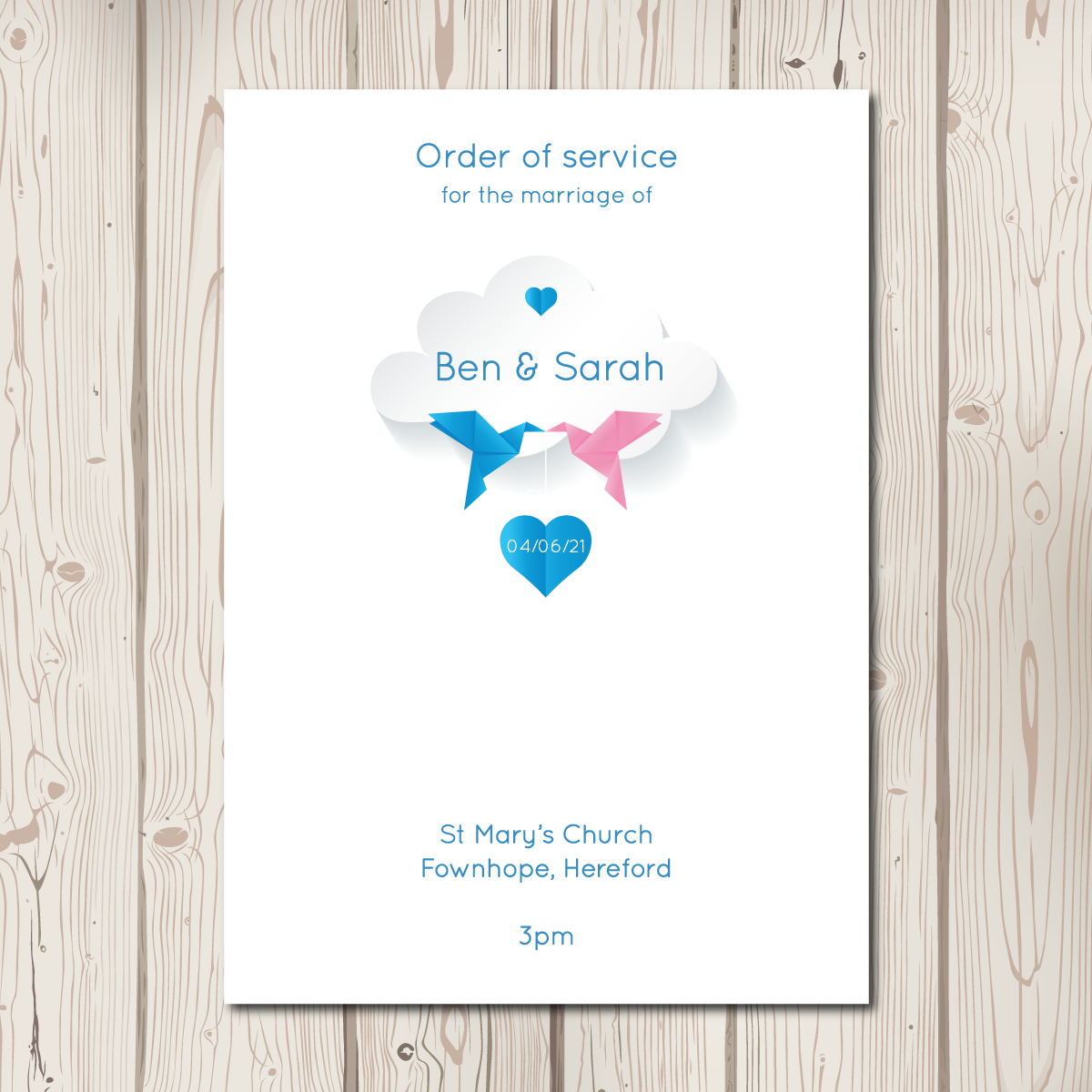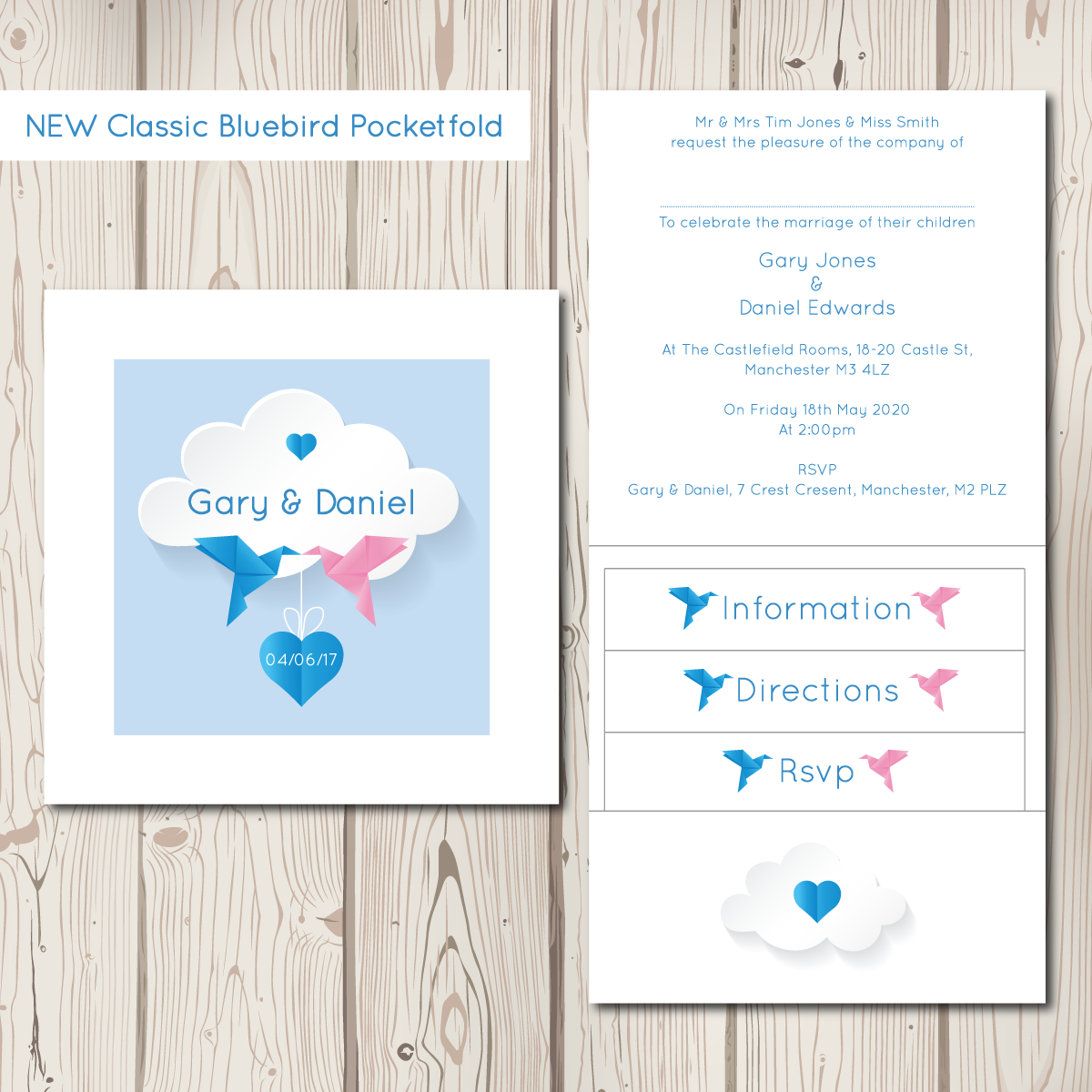 We have finished our new BlueBird range! A beautifully modern take on our classic love birds. Featuring origami pink and blue birds (colours can of course be changed!) carrying a small love heart, a plain coloured background, a simple clean font and a delicate cloud. The full range includes pocketfolds, evening invitations, save the date cards, placecards, table numbers, order of service sheets and table plans.