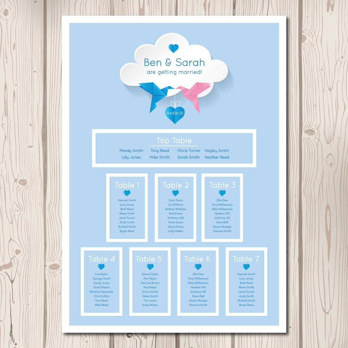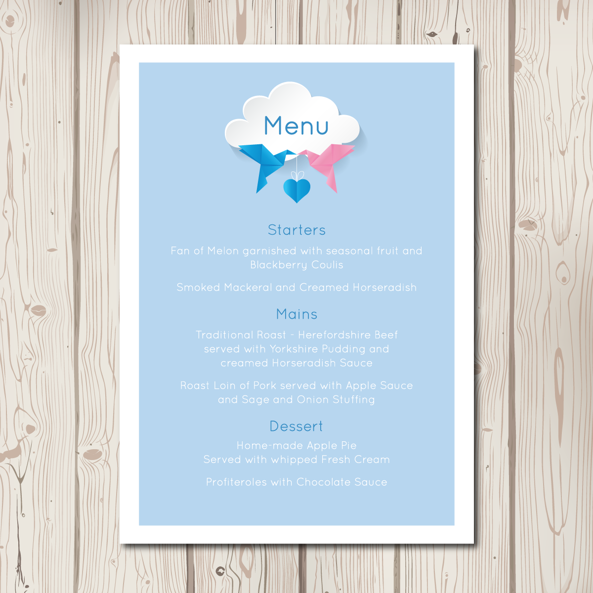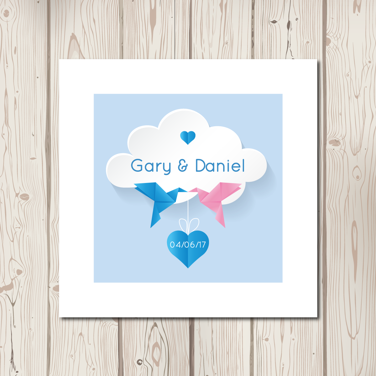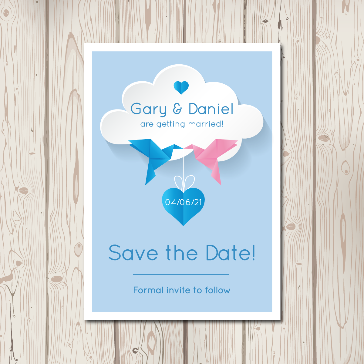 We have finished our new BlueBird range! A beautifully modern take on our classic love birds. Featuring origami pink and blue birds (colours can of course be changed!) carrying a small love heart, a plain coloured background, a simple clean font and a delicate cloud. The full range includes pocketfolds, evening invitations, save the date cards, placecards, table numbers, order of service sheets and table plans.